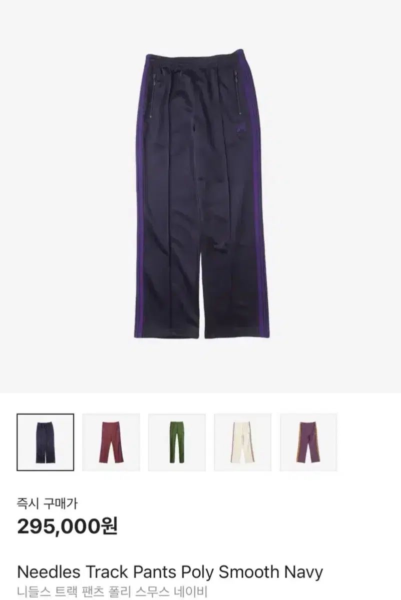 ネイビーカラーのニードルズストレートトラックパンツ。Lサイズで、紫のラインがアクセントになっています。