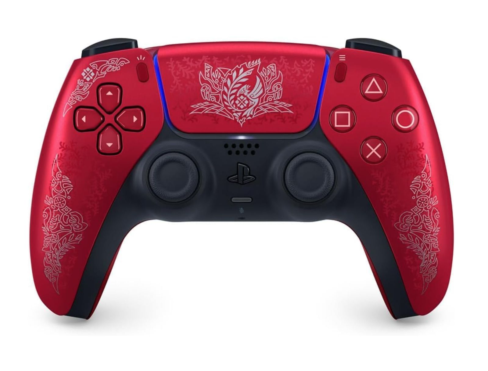 作中のハンターが最初に身に纏う装備にあしらわれた模様をモチーフにした繊細なデザインが、ヴォルカニック レッドのDualSense ワイヤレスコントローラーの両サイドに銀色で浮かびあがります。