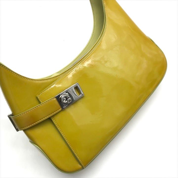 Ferragamo フェラガモ ガンチーニ エナメル ワンショルダー バッグ 肩掛け イエロー グリーン レディース ブランド 鞄 かばん r 494