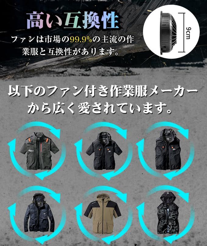 【最適な空調作業服!】2025年中盤モデルのバッテリーは、さらに性能が向上し、最高出力54Vのハイパフォーマンスを実現しました。最大風量は業界トップクラスの235リットル/秒を誇り、最大風量を2.5時間連続で持続させることができます。多くの機器が短時間しか最大出力を維持できない中、このスペックは際立っています。また、33V風量モードでは約11.5時間の連続運転が可能で、低出力でも十分な風量を提供し、驚異的な総合性能を発揮します。90mmファンホールに高い互換性があり、市販の空調作業服や空調パンツ、空調バッグなどと組み合わせて最適に使用できます。