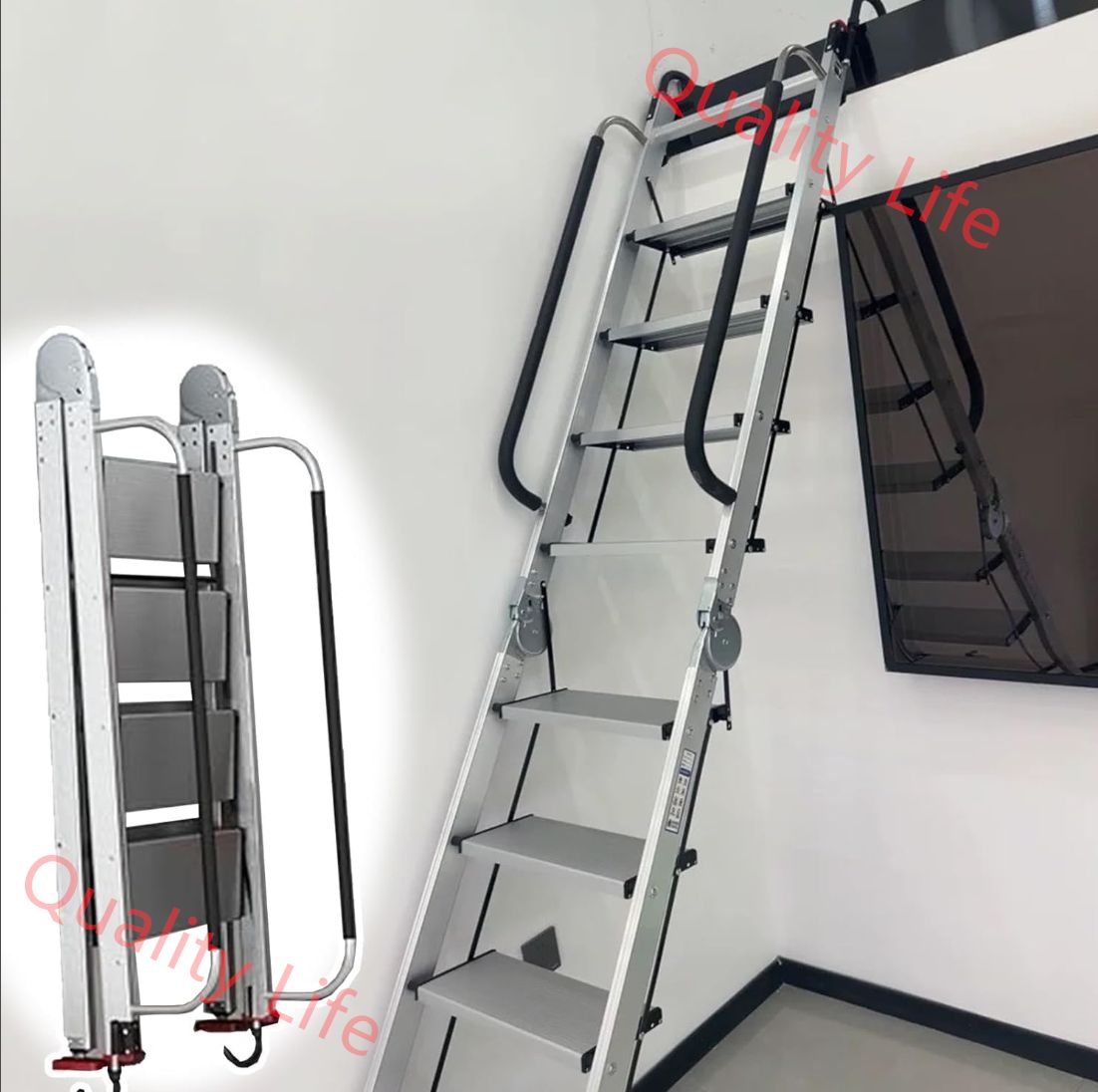 ? 【 折りたたみ式はしご 】: 折りたたみ式のデザインにより、ロフトはしごの保管や持ち運びが簡単になります。使用しないときは、場所を取らずに小さく折りたたんで保管できます