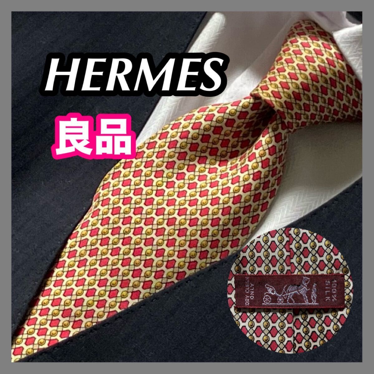 HERMES エルメス ネクタイ 変形H柄 丸 レッド 赤 イエロー 黄色 総柄 シルク フランス製