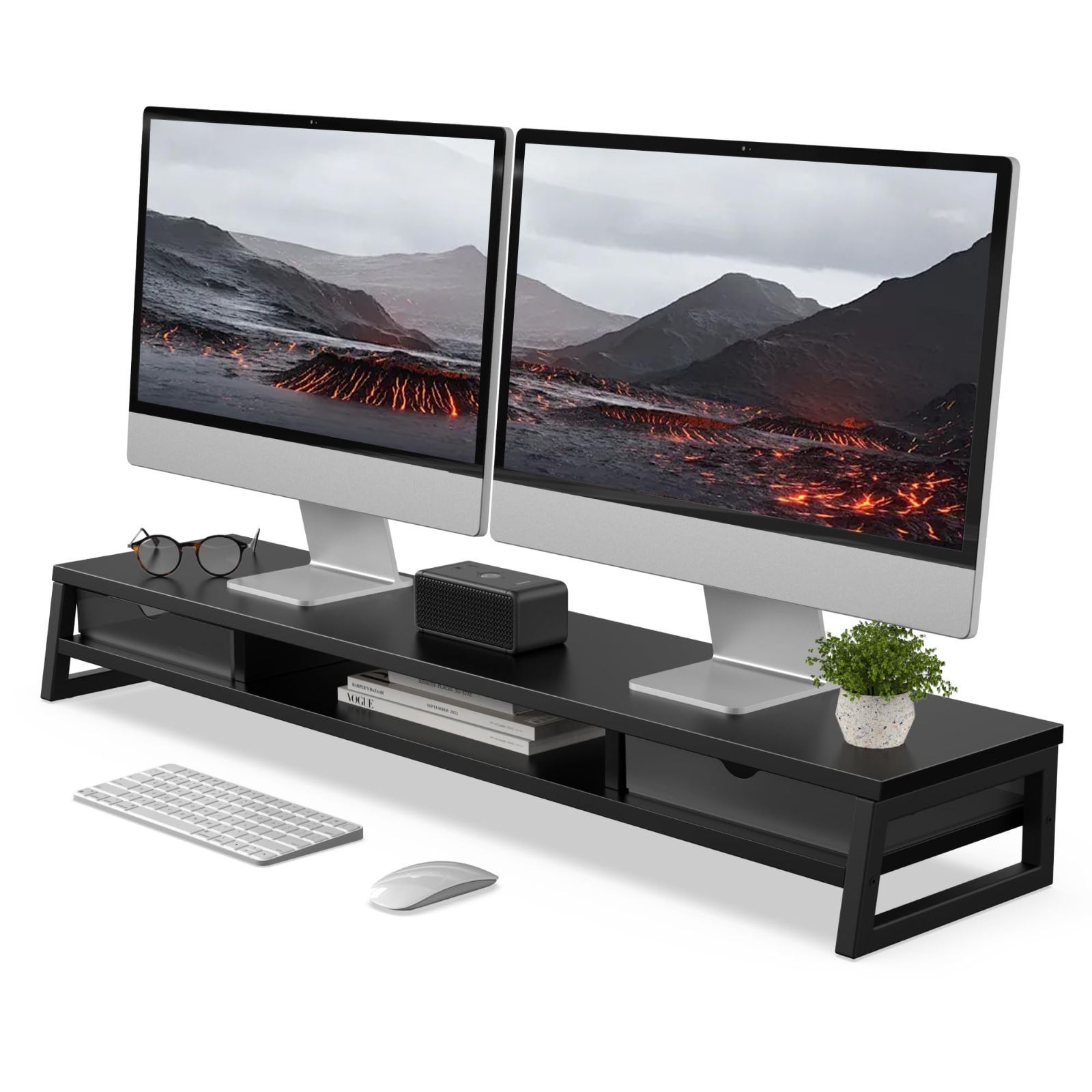 Fenge モニター台 卓上 デスクシェルフ モニタースタンド パソコン台 引き出し付き2段 木製 幅108cm pc台 机上台 デュアルモニター 台 机上ラック 卓上台 デスク周り収納 ディスプレイ (ホワイト) (ブラック)