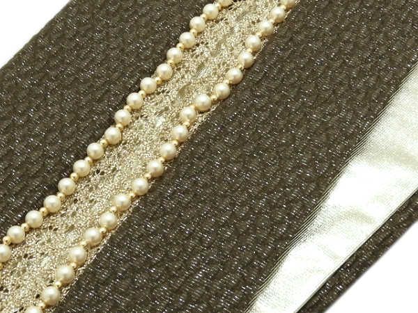 ラメ入り変り織りのオリーブ系に輝くパールと金のラメレース、裏面はゴールドの重ね襟!