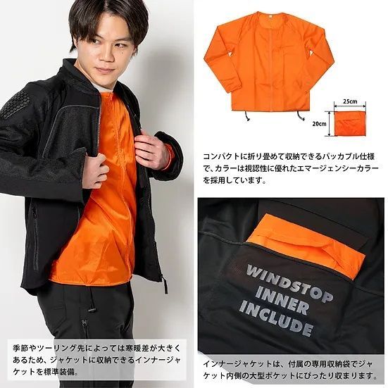 ●季節やツーリング先によっては寒暖差も大きくあるため、インナージャケットを標準装備。インナージャケットはコンパクトに折り畳めて収納できるパッカブル仕様で、付属の専用収納袋でジャケット内側の大型ポケットにぴったり収まります。