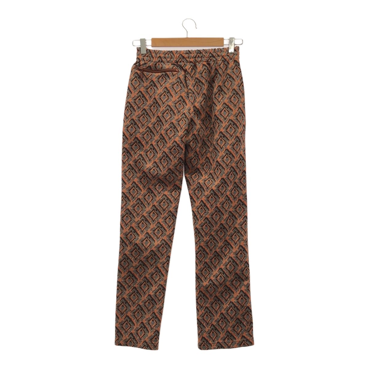 NEEDLESのトラックパンツです。タグ付き。オレンジカラーと、個性的な総柄ジャガードが目を引くデザイン。ポリエステルジャージー素材を使用しており、程よい光沢感が特徴です。サイドラインを省いたシンプルなデザインで、素材感と相まって、カジュアルだけでなくジャケットや革靴など、ドレスライクなスタイルにも合わせやすいのが魅力です。伸縮性、通気性にも優れており、快適な穿き心地。スタイリングのアクセントとして活躍するおすすめのアイテムです。