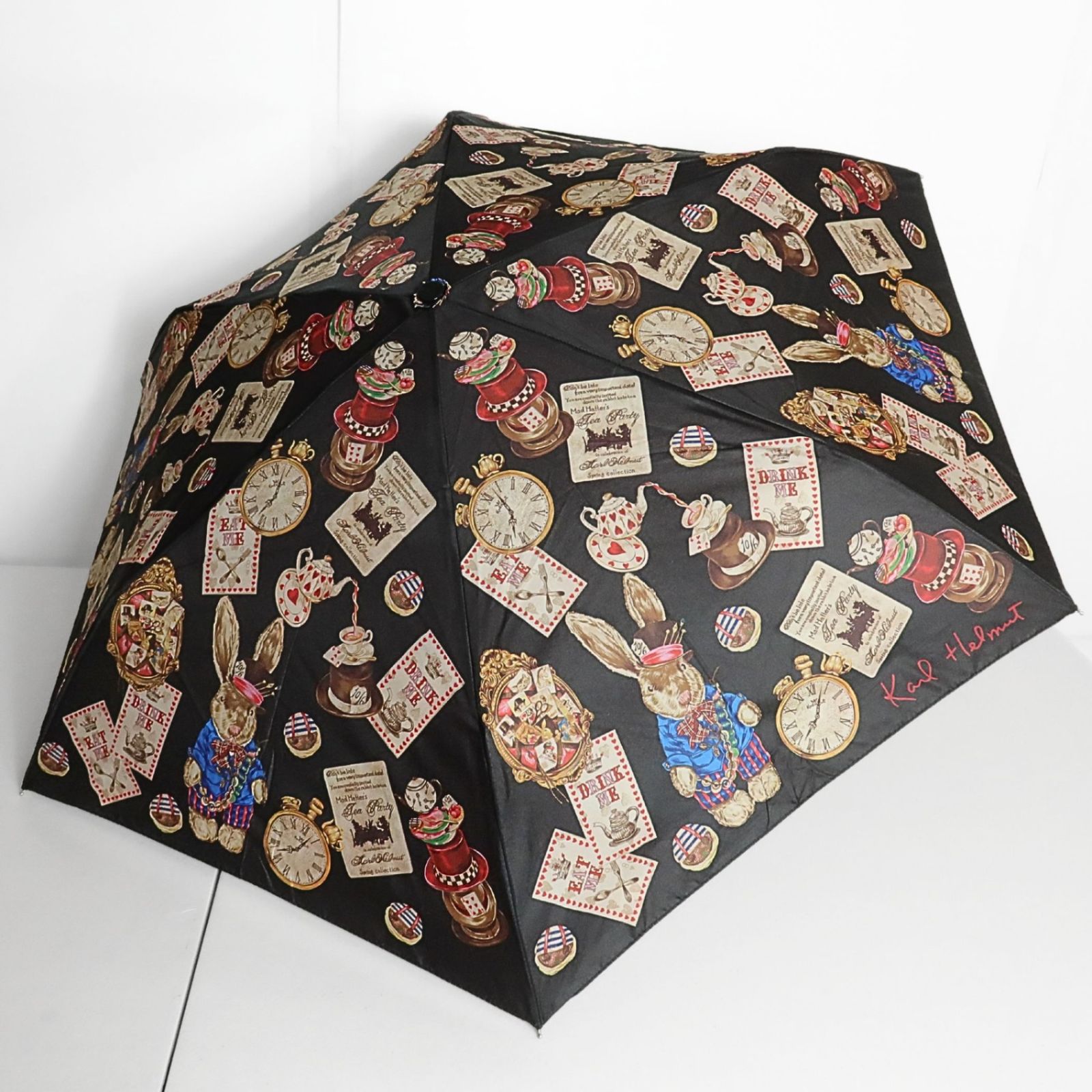 ピンクハウス うさぎとカード ティータイム 不思議の国のアリス柄 折りたたみ傘 黒系 k3737