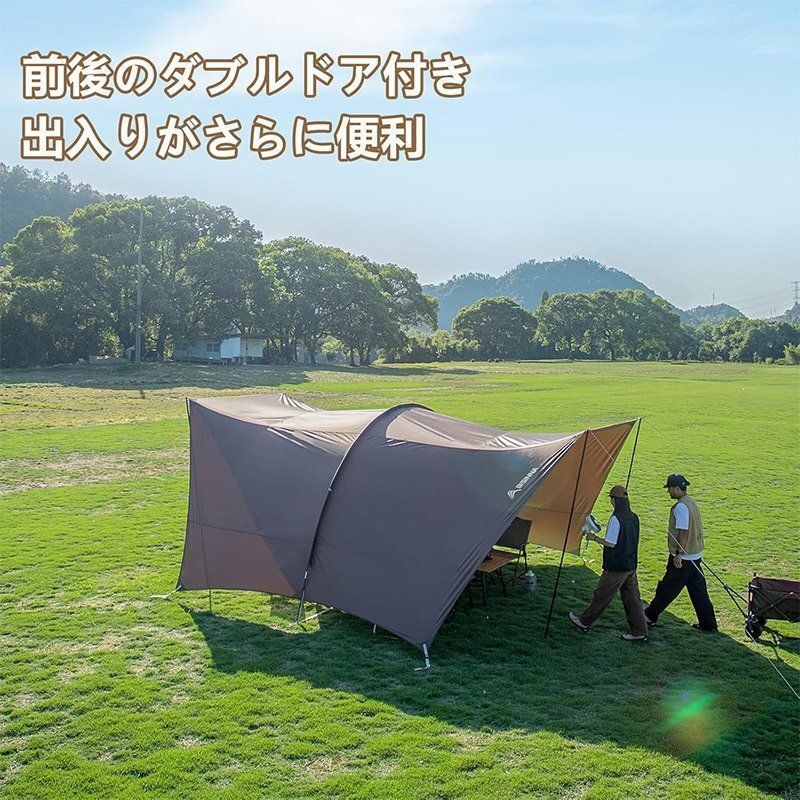 【進化したトンネル型デザイン】トンネル型の設計により、防風性と防雨性を高めながら、夏の日差しを360度カットし、快適なシェード空間を提供します。広い開口部から風が通りやすく、自然な換気でタープ内の温度を快適に保ちます。8~16人がゆったり過ごせる大容量スペースと十分な高さで、家族やグループでのアウトドアにぴったりです。