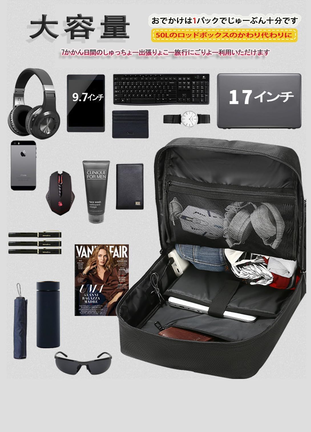 【大容量の60L防水リュックサック】サイズ:約縦58cm × 横33cm × マチ19cm、収納可能サイズ: 50-60L(物でいっぱいのすべてのポケット)、重さ:2.0Kg。スクエア型収納力抜群、最大17インチPC、Pad、A4サイズの書類や着替え、サングラス、帽子など必要なアイテムを、まとめて収納。キャンプや登山道具、旅行なら3~5泊分の荷物が余裕で入り、タウンユースだけでなく、非常時持ち出し用の防災リュックとしても十分ご活用いただけます。