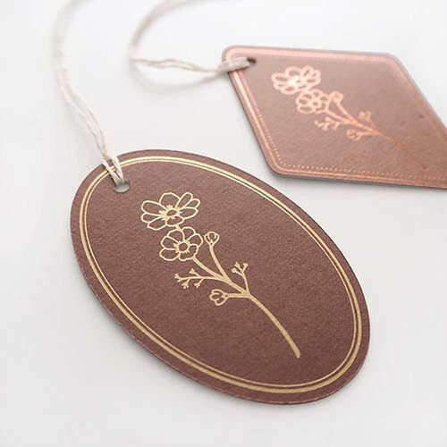 クラフト感のあるカードに、一輪のお花の箔押しをあしらったギフトタグ。楕円形のタグには金箔を、菱形のタグにはコッパー箔を使い、上品なデザインに仕上げました。裏面にメッセージが書けるので、ひとこと気持ちを添えたいときにおすすめです。風合いのあるリネンの紐つきで、贈り物に付けるとラッピングのアクセントになります。【検索ハッシュタグ】#エルコミューン#フローラ#ギフトタグ#バラ#ゴールド