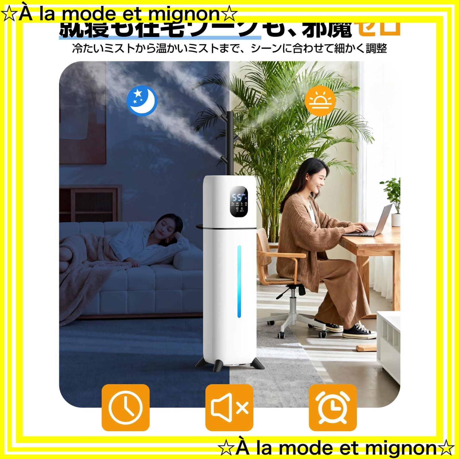 ??【立体広角噴霧&スマート制御】-従来の単方向噴霧とは異なり、樹枝状に広がる4方向ノズルがミストを立体拡散。部屋の隅々まで均一に潤し、ムラのない加湿を実現します。内蔵の高精度湿度センサーが室内を常時監視し、設定湿度(40?90%)を自動維持。ミストは弱・中・強の3段階と、超音波式/加熱式の2モードを自由に調整可能です。ジメジメもカラカラも防ぎ、常に「ちょうどいい」湿度をキープ。1?9時間のタイマー機能付きで、消し忘れの心配もありません。もう湿度を気にしたり、ボタンを操作する必要はありません。本タワー加湿器が、あなたに最適な環境を“自動で”創り上げます。