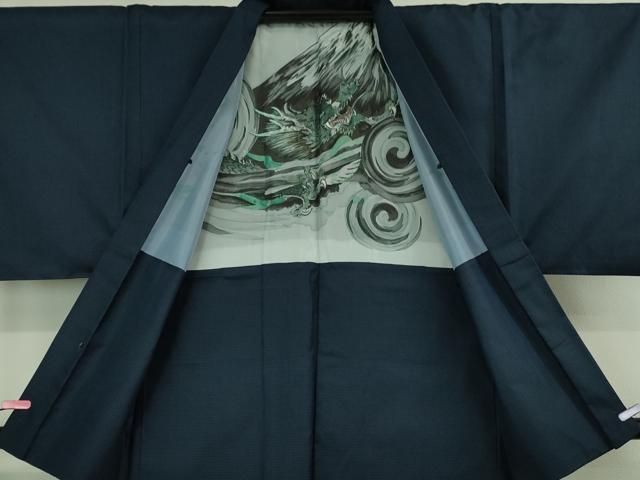 平和屋着物 上 男性 紬 アンサンブル 長襦袢 無双仕立て 長羽織セット 100亀甲 総詰め 濃藍色 羽裏 龍 kh 5