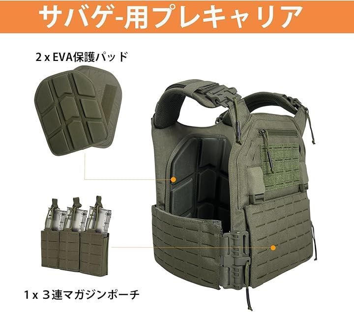 タクティカルベスト サバゲー用 3連 マガジンポーチ付き 軽量 プレートキャリア レーザー切断 サバイバルベスト MOLLE モール 戦術 クイックリリース バックル サイズ調整可 1000 Dナイロン レンジャーグリーン