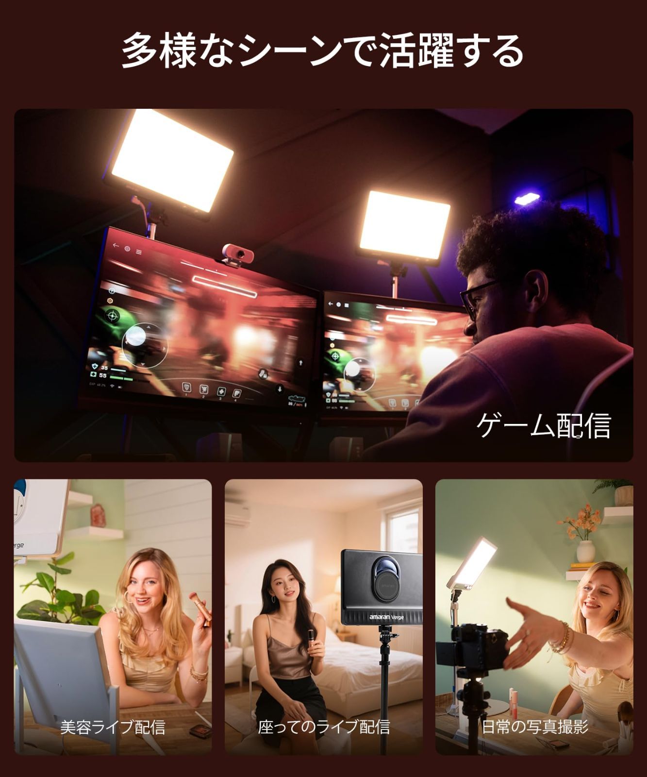 マルチコントロール対応: 前面のノブ、amaranデスクトップアプリ、Stream Deckプラグインで簡単操作。ライティング効果(花火、雷、ストロボなど7種類)も可能。