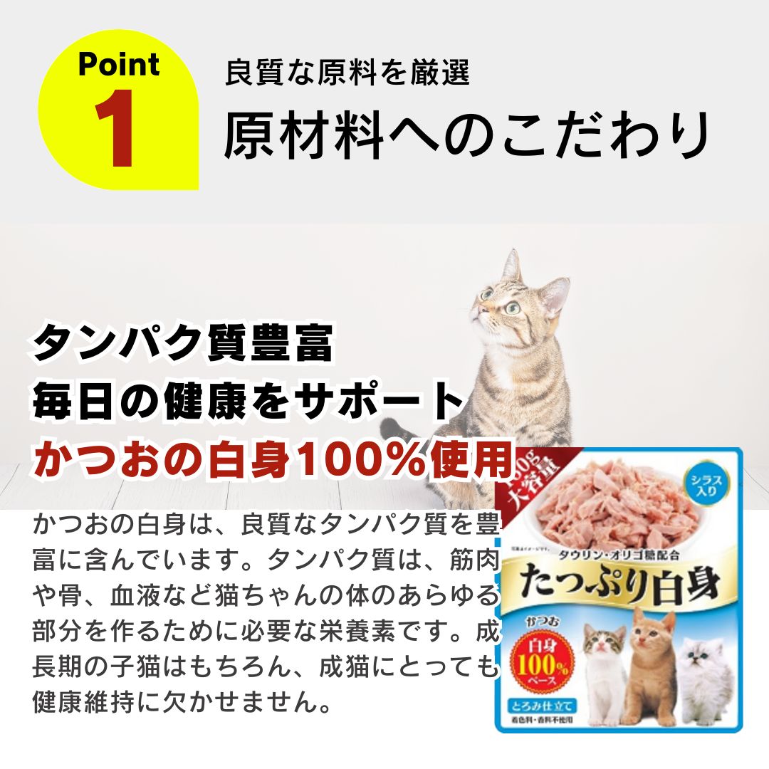 ・かつおの白身のみ使用:かつおの白身は高タンパク質で低脂肪。ヘルシーで、猫ちゃんの健康維持に役立ちます。