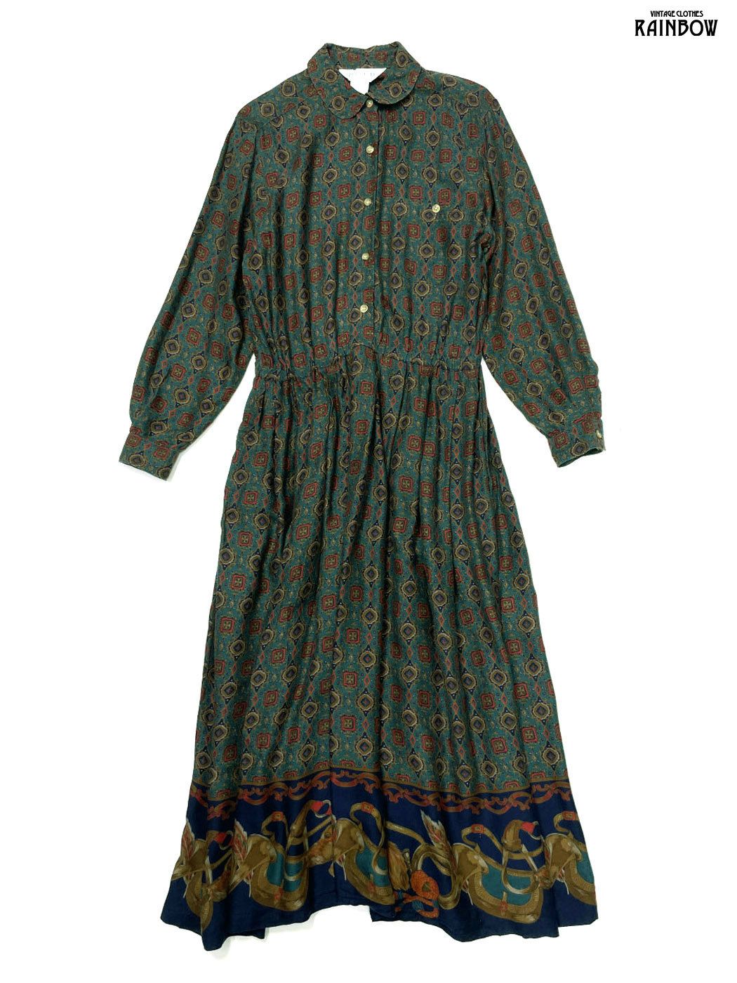 #ワンピース #ロングスリーブ #ロング丈 #ゴムウエスト #緑 #総柄 #クラシック #レーヨン #長袖総柄ワンピース