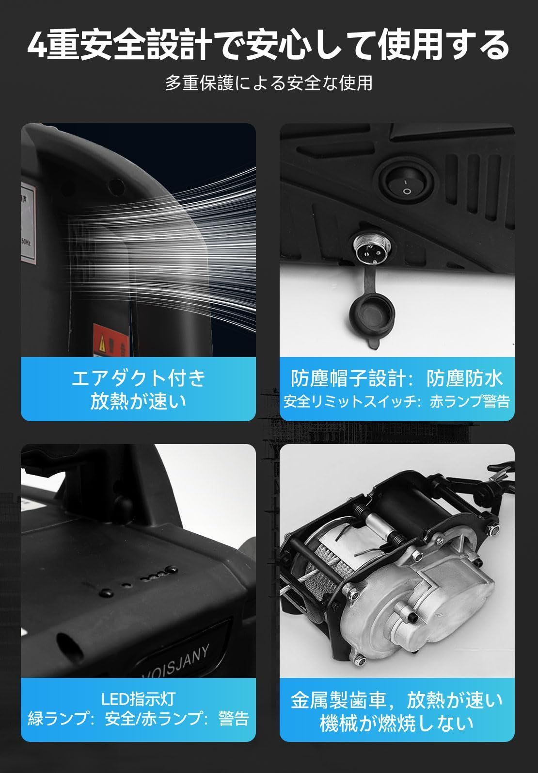 【安全機能で安心の使用感】電動ウインチには一定の高さに達すると自動的に電源がオフになる安全スイッチや、重量を感知してアラームを発するLED付きスイッチが装備されています。また、航空級のワイヤロープは回転防止機能を備え、耐久性が向上しています。これらの安全機能により、電動ウインチをより安心してご使用いただけます。