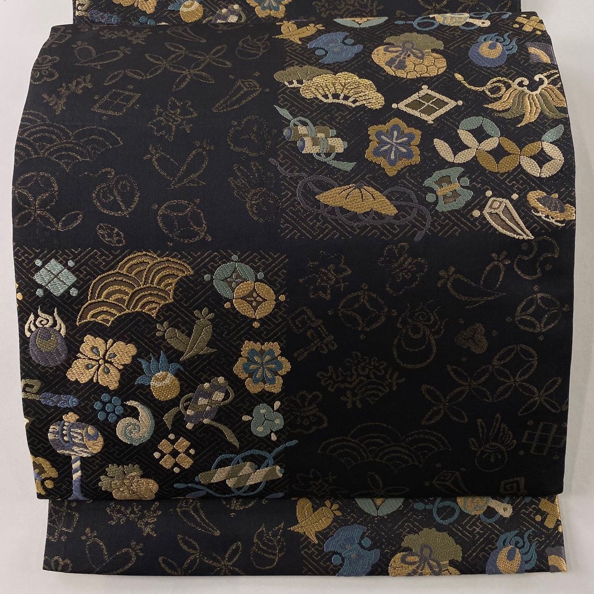 袋帯 秀品 宝尽くし 紗綾形 金糸 箔 焦茶色 六通 正絹
