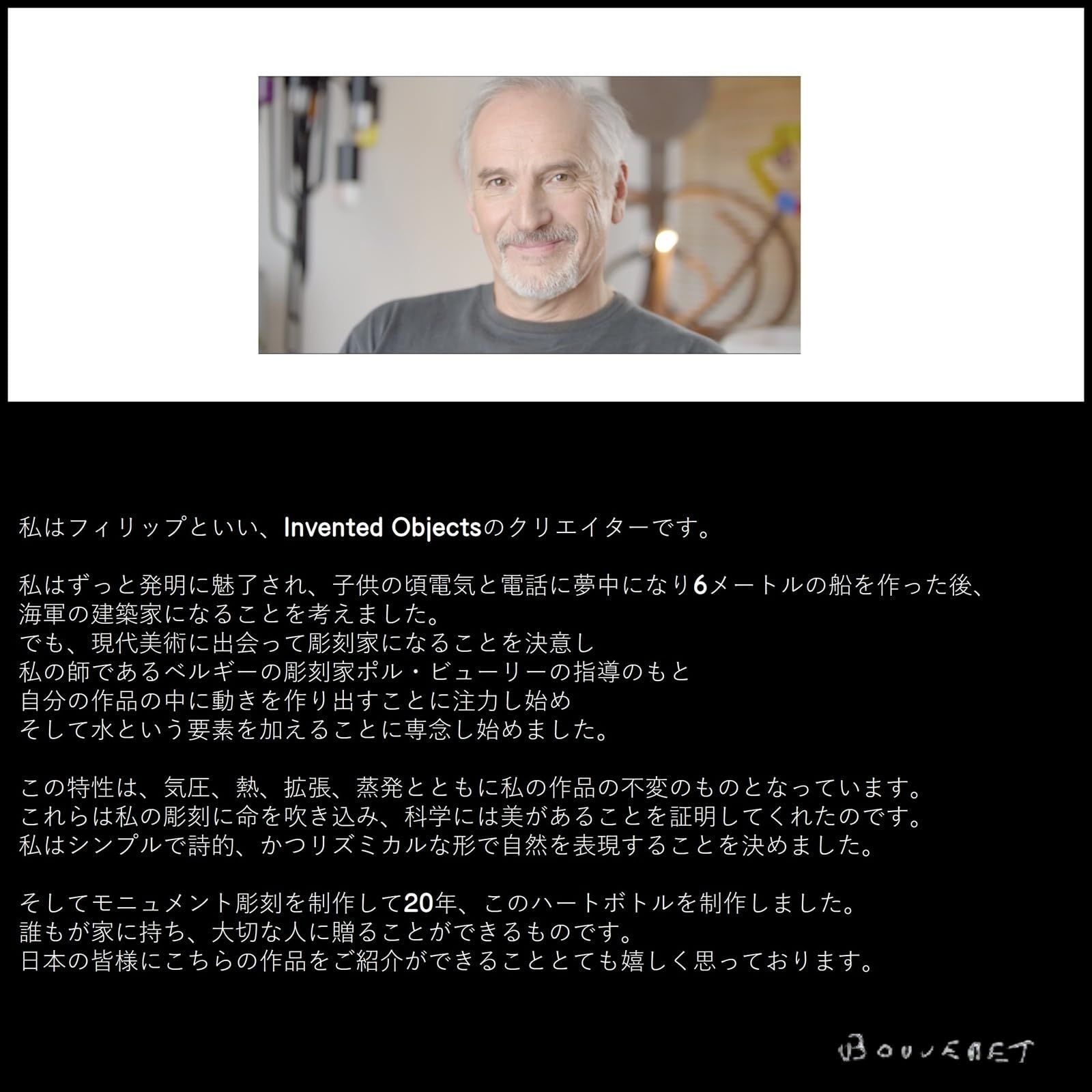 フランスの彫刻家Philippe Bouveretが手掛ける、芸術性あふれる100ml d'eau de vie(ハートボトル)。水と重力だけで身体の最も象徴的なハートが透明なガラス瓶の中で鼓動するインテリアオブジェで、見ていると心を落ち着かせなごみます