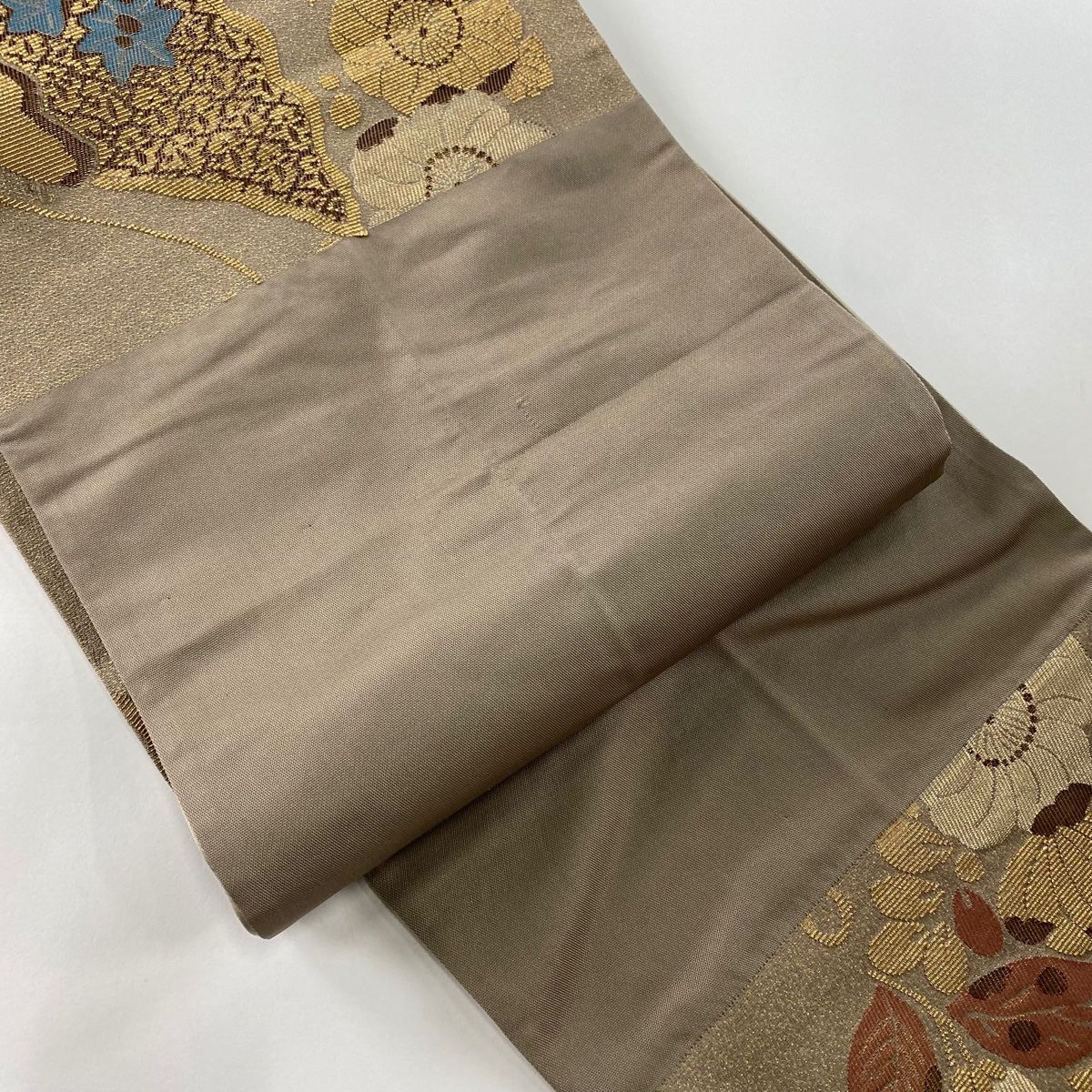 袋帯 落款 草花 蝶 金糸 輪奈織 薄茶色 六通 正絹