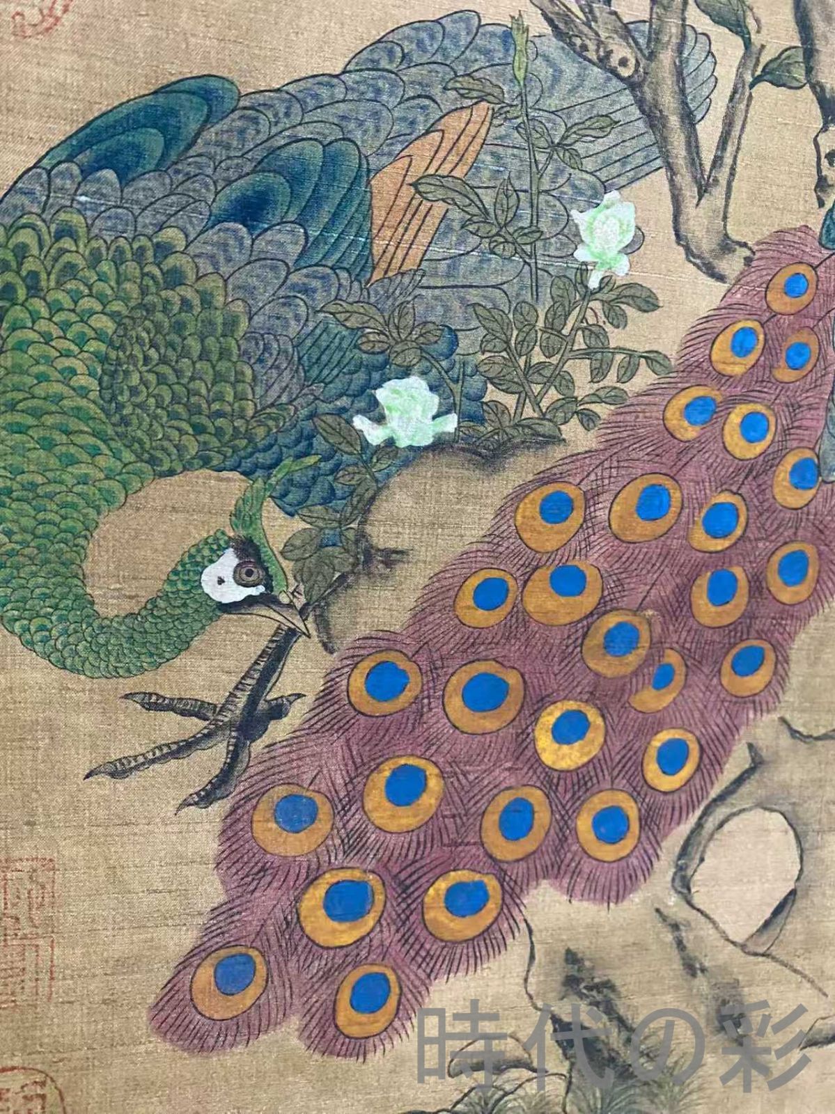 宋代の画家・趙昌による孔雀花図を題材とした四尺中堂画です。絹布に手描きされた精緻な花鳥画で、孔雀の優雅な姿と花卉の色彩が見事に表現されています。?装済みで鑑賞や掛軸飾りに適し、コレクション価値も高い逸品です。