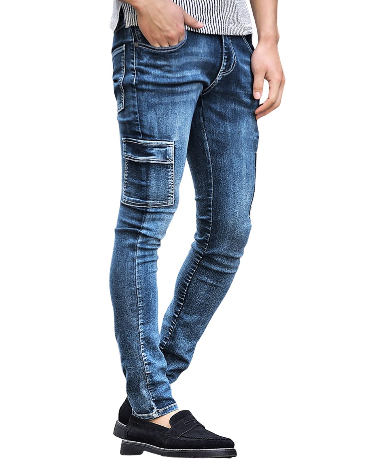 S_インディゴ(カーゴ) [ルービック] 選べるデザインスキニーデニムパンツ ジーンズ メンズ ダメージ カーゴ パッチワーク 細身 ストレッチパンツ スキニー S インディゴ(カーゴ)