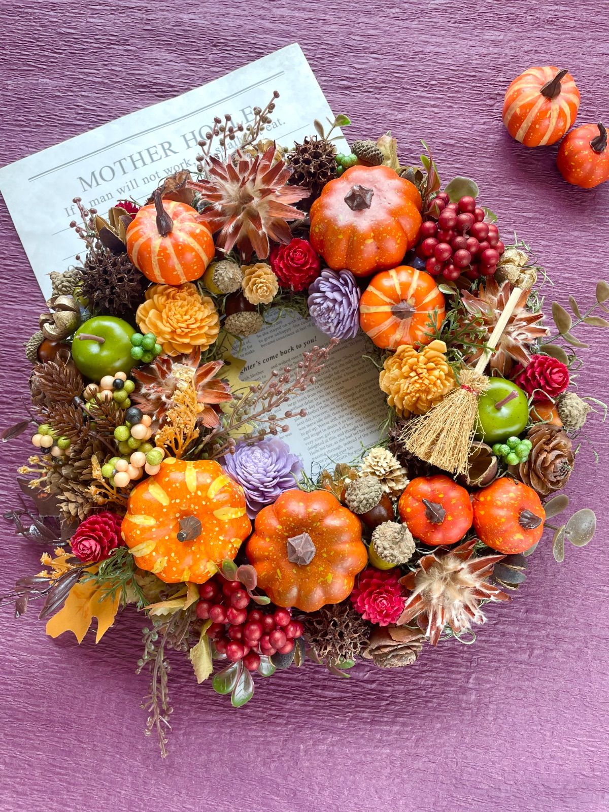 フラワーリース ウエルカムリース 玄関リース かぼちゃ パンプキン オレンジ ホウキ ハロウィン オフィス