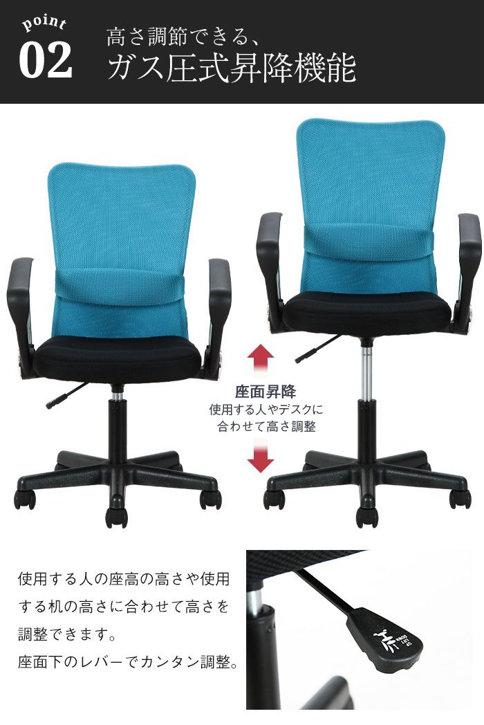 ガス昇降式でデスクや体型に合わせて高さ調節ができます。