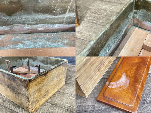 囲炉裏内側や小物には使用による錆や変色があり、天面台にも染みや擦れ傷が多く見られます。