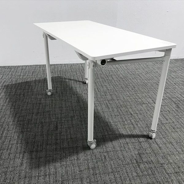 座る方向を選ばない4本脚のデスク。キャスター付で自由にレイアウト変更ができます。天板をはね上げた状態で平行に重ねることができ、収納効率にも優れています。