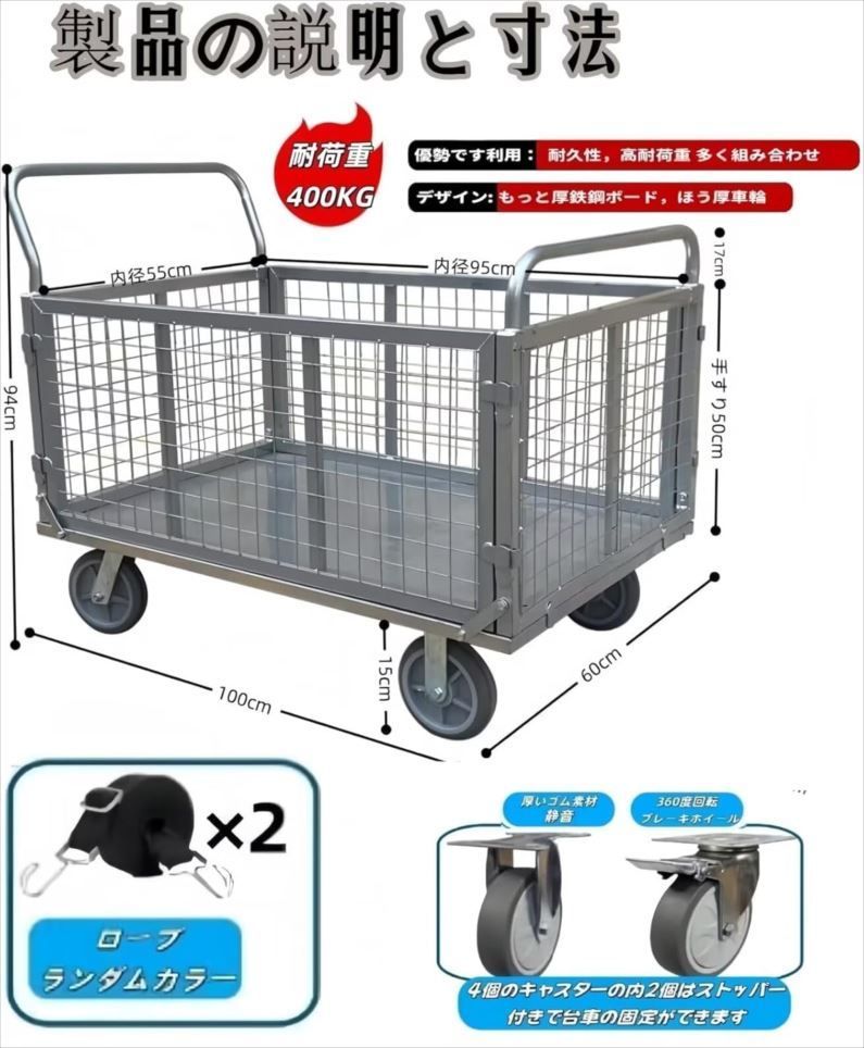 メッシュカートは堅固な構造で強化フェンスネット。裏側に強化クロスバーを3本取り付けており、踏み板の衝撃を和らげ、最大800kgの積載能力を備えた。構造が安定しており、変形したり損傷したりしにくいため、荷物にしっかりとした信頼性の高い支持プラットフォームを提供します。