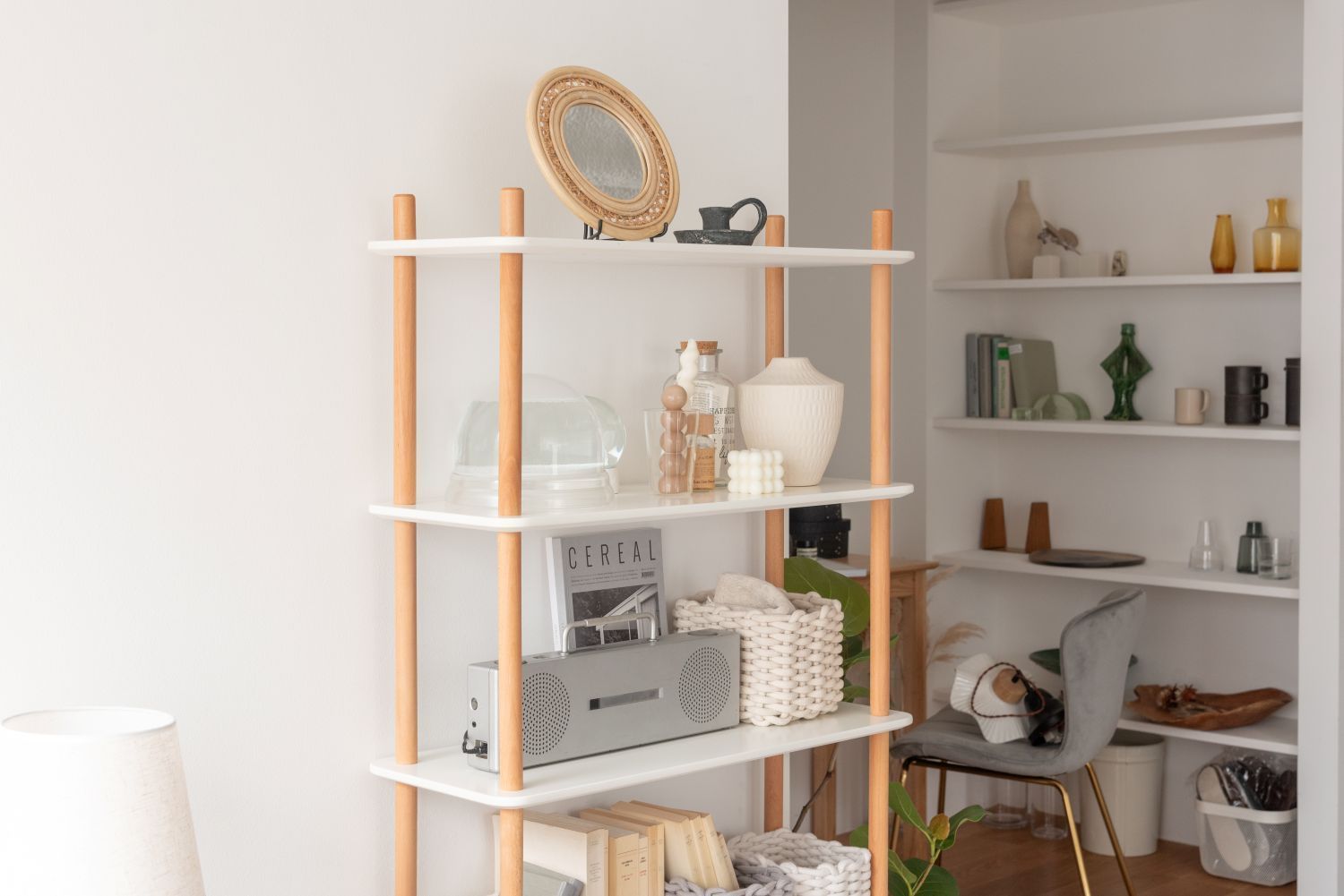 ホワイトの棚と天然木のナチュラルカラーな支柱が優しい印象を与えてくれる、5サイズのラックです。