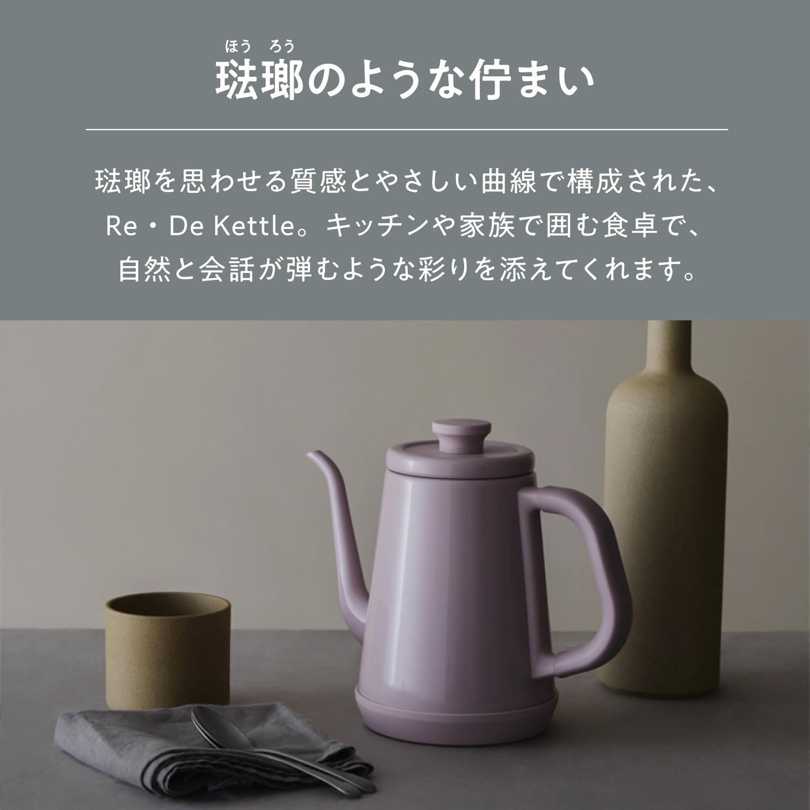 【料理が得意なケトル】持ちやすさと湯切れのよさ、細やかな温度調節機能でお湯を使う調理を上手にアシスト。デザイン性も良く、上品な佇まいで、食卓を素敵に彩ります。