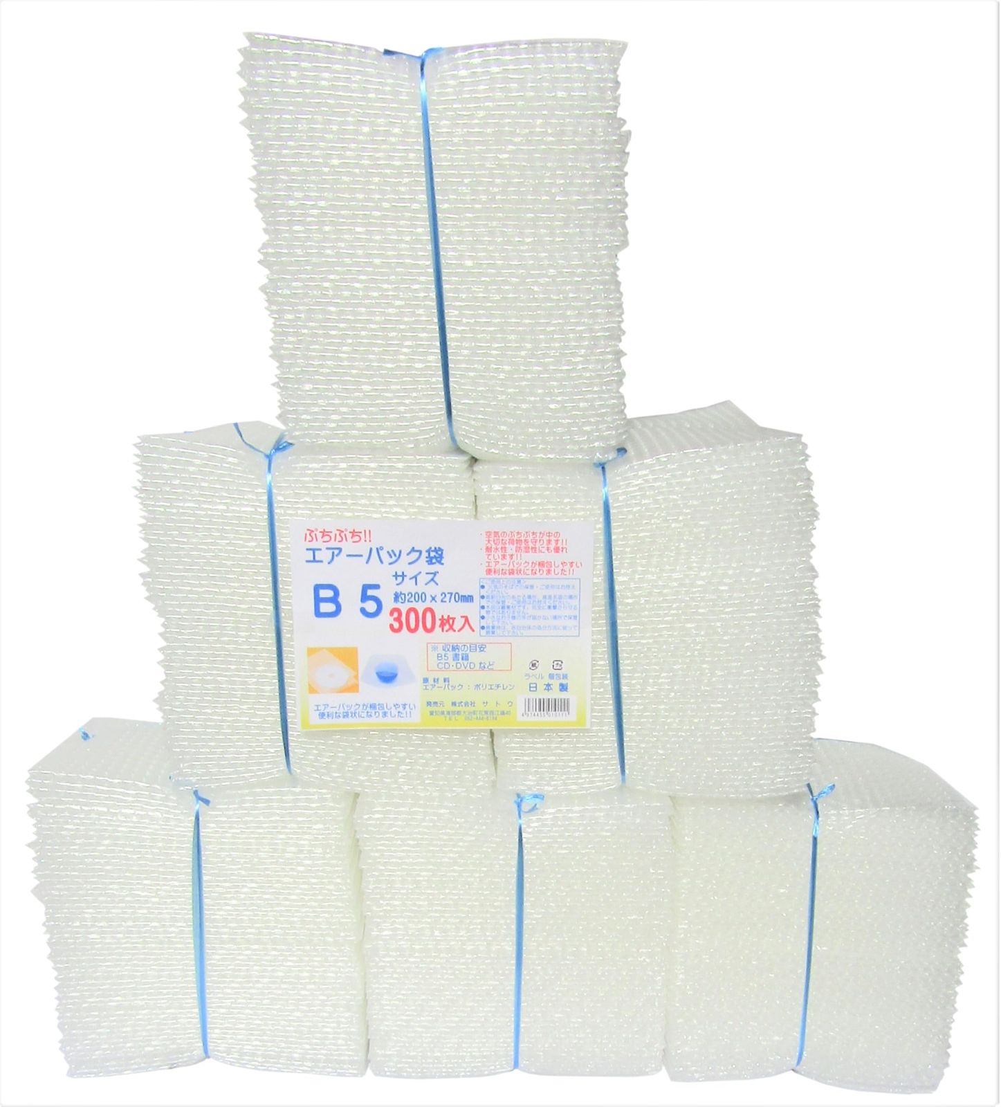 サトウ エアーパック 袋タイプ 300枚入 B5サイズが入る 約横20cm×縦27cm 透明 プチプチ 包装 梱包用 緩衝材 割れやすい物の保護に 日本製