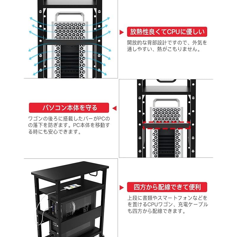 ?【落下防止バー、排熱を妨げない設計、収納棚】?ワゴンの後ろに搭載したバーがPCの落下を防ぎます。PC本体を移動する時にも安心できます。?開放的な背部設計ですので、外気を通しやすい、熱がこもりません。?中棚の隙間からコードが通せるので、携帯電話やタブレットなどを充電しながら置くことができます。?中棚にルーター・モデム類やヘッドホンなどデスク周りの小物の収納にも便利です。