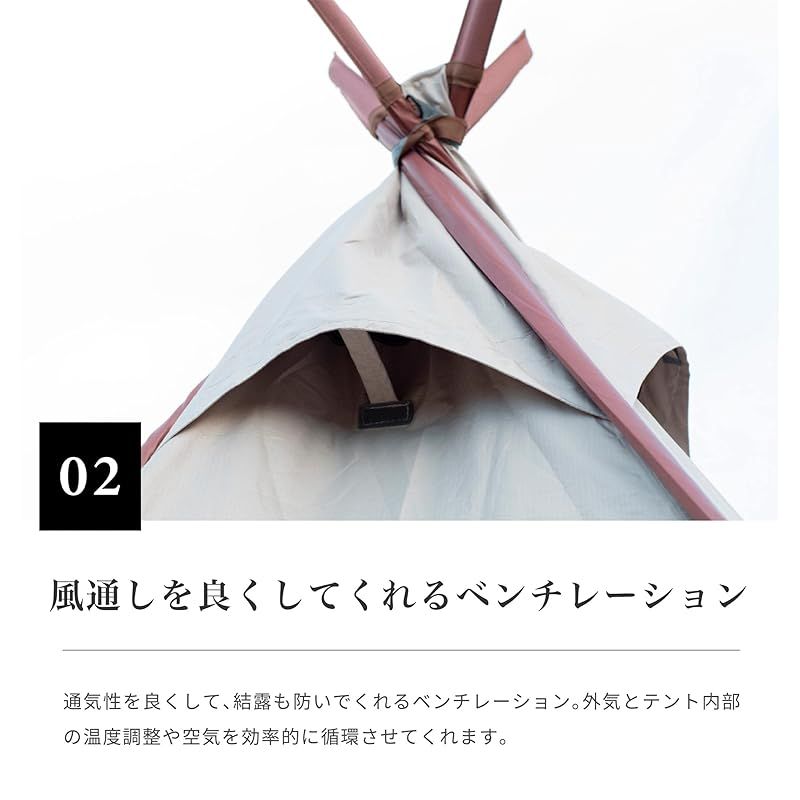 【ソロキャンプなどに最適なティピー型個性派テント】1~2人用で使用できるティピー型テント。ソロキャンプやカップルなど少人数での使用におすすめ。組立が簡単なので、女性キャンパーの方にも使いやすいテントです。キャンプはもちろん、ピクニックなどの簡易テントとしてもお使い頂けます。
