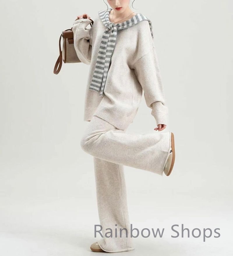 ニット セットアップ レディース 秋冬 春 カジュアル 大きいサイズ ニットセットアップ ニットセーター プルオーバー バイカラー ワイドパンツ ニットベスト 長袖