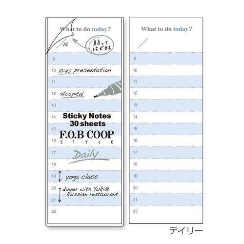 FOBCOOP、シンプルで快適な使い心地の文具シリーズ。丈夫な透明PP表紙のついたのり付メモ。白上質紙素材、毎日の予定が記せるデイリー罫、9時から22時までの予定が書きこめるので、スケジュール管理にとても便利です。貼って剥がせるのり付、付せんタイプ。ダイアリーやノートと組み合わせて使用するのがおすすめ。シンプルなデザインなのでビジネスにもプライベートにもシーンを選ばず使用できます。枚数が30枚なので、1か月しっかりと書きこんで日々の管理を。【検索ハッシュタグ】#マスキングテープ#マステ#ますて#テープ