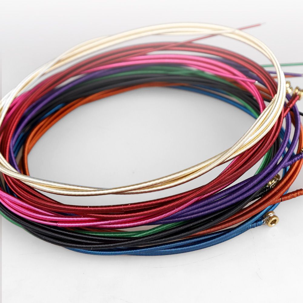 弦はニッケルメッキの巻き弦で、アメリカ製です。弦は美しい金属光沢があり、剥がれにくい仕様です。赤、黒、金、青、ピンクなど様々な色を選択でき。単品のセット弦は全て同じ色で統一されていますが、複数セットを購入してカラーミックスも可能です。
