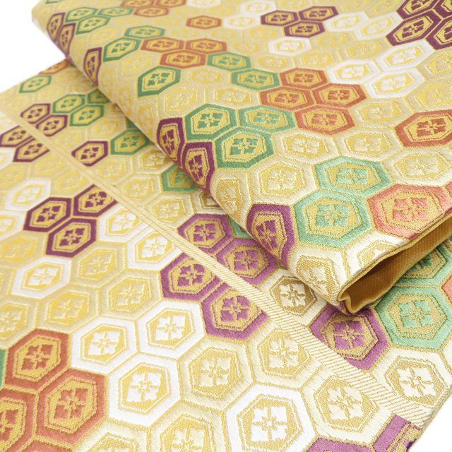 開き名古屋帯 なごや帯 リサイクル 正絹 カジュアル 人間国宝 喜多川平朗 亀甲花菱文 黄系色 多色 きもの北條 A 1276-9