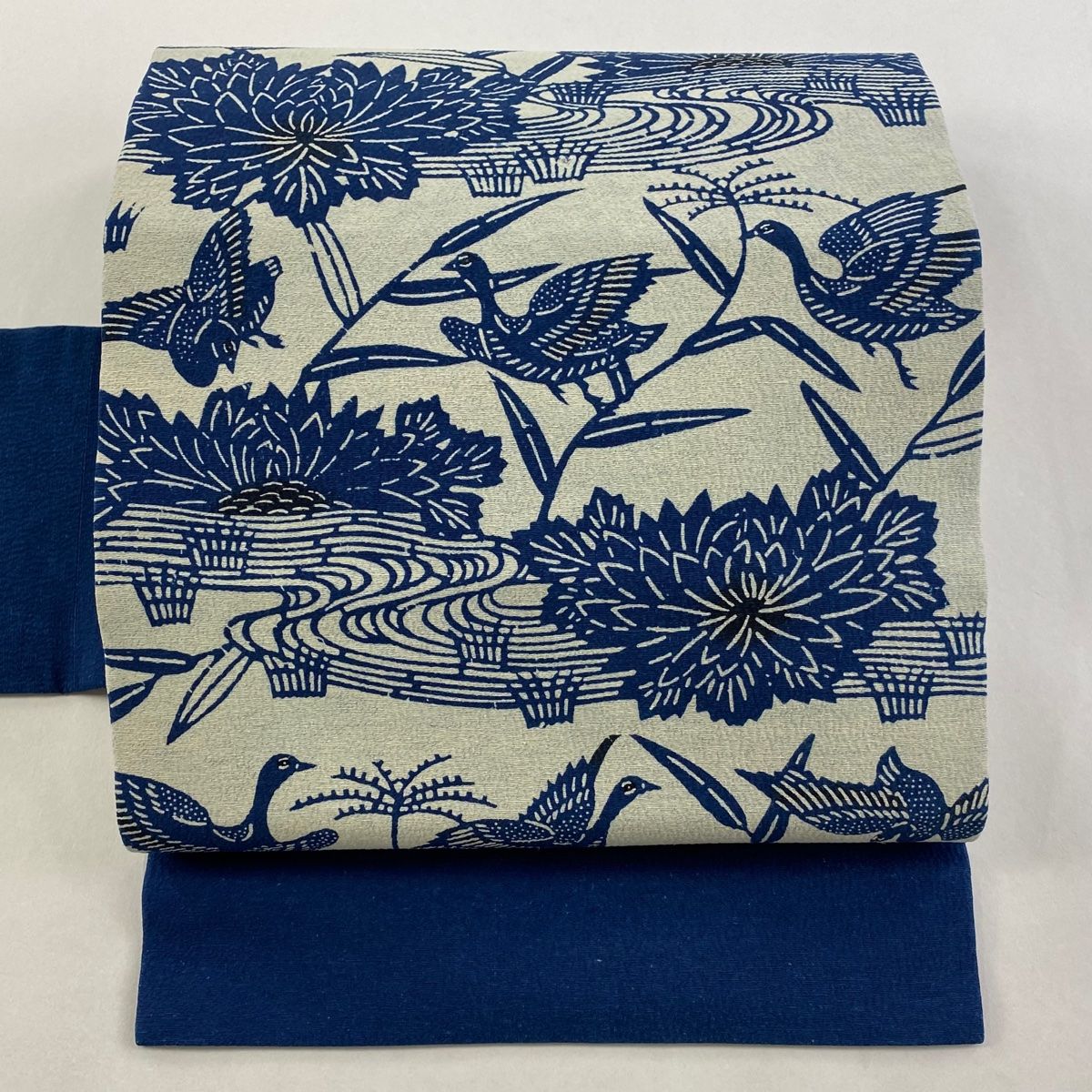 名古屋帯 秀品 紬地 花鳥 流水 紺色 正絹