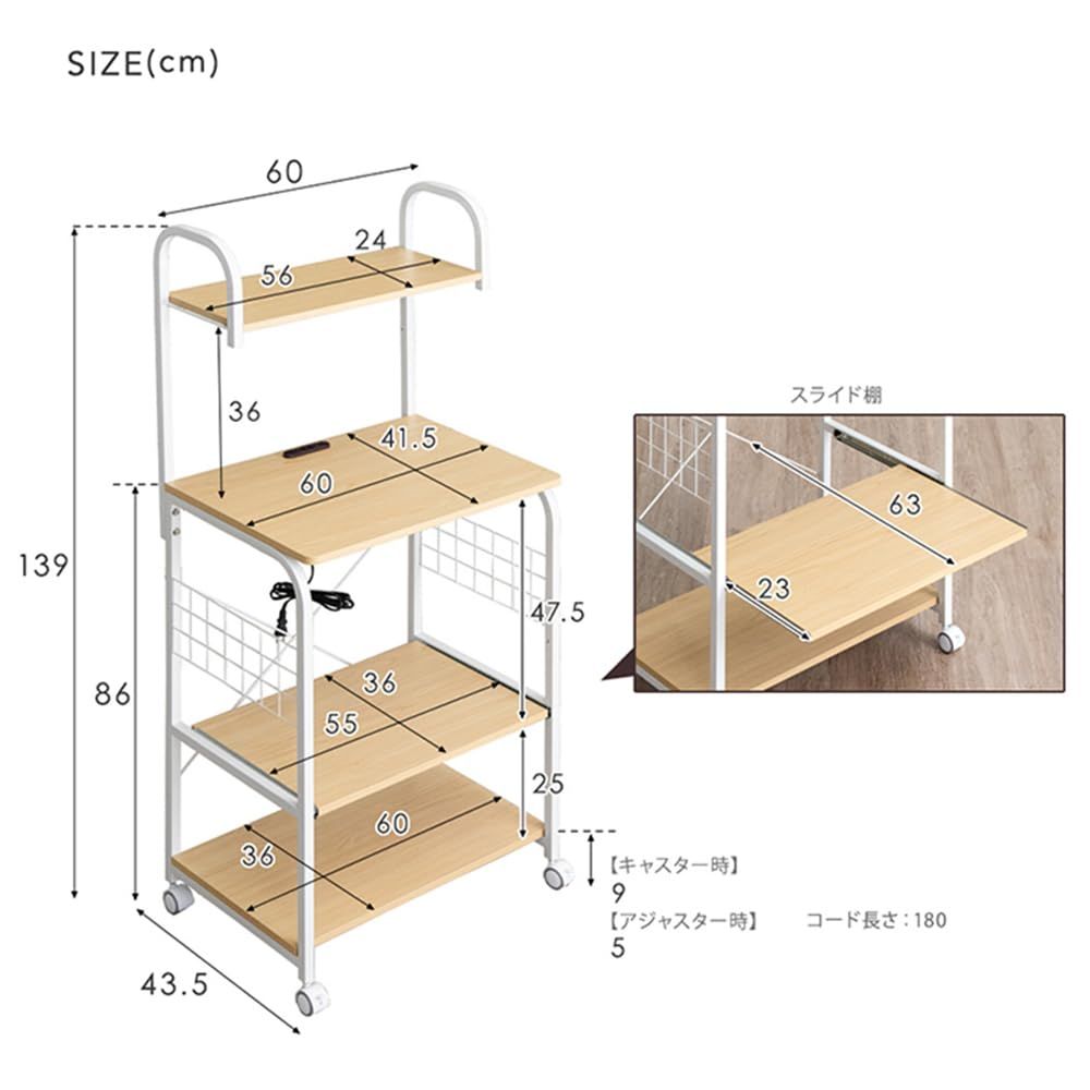 タンスのゲン レンジラック 幅60 キャスター付き 大型レンジ対応 高さ139cm 2口コンセント付き スライド棚 スリム レンジ ナチュラル キッチンラック 17620022(88099)