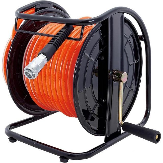 ●20mのエアホースもハンドル操作だけで簡単に素早くまとめられ収納も簡単で、30cm四方のスペースがあれば収納できるコンパクトサイズです。