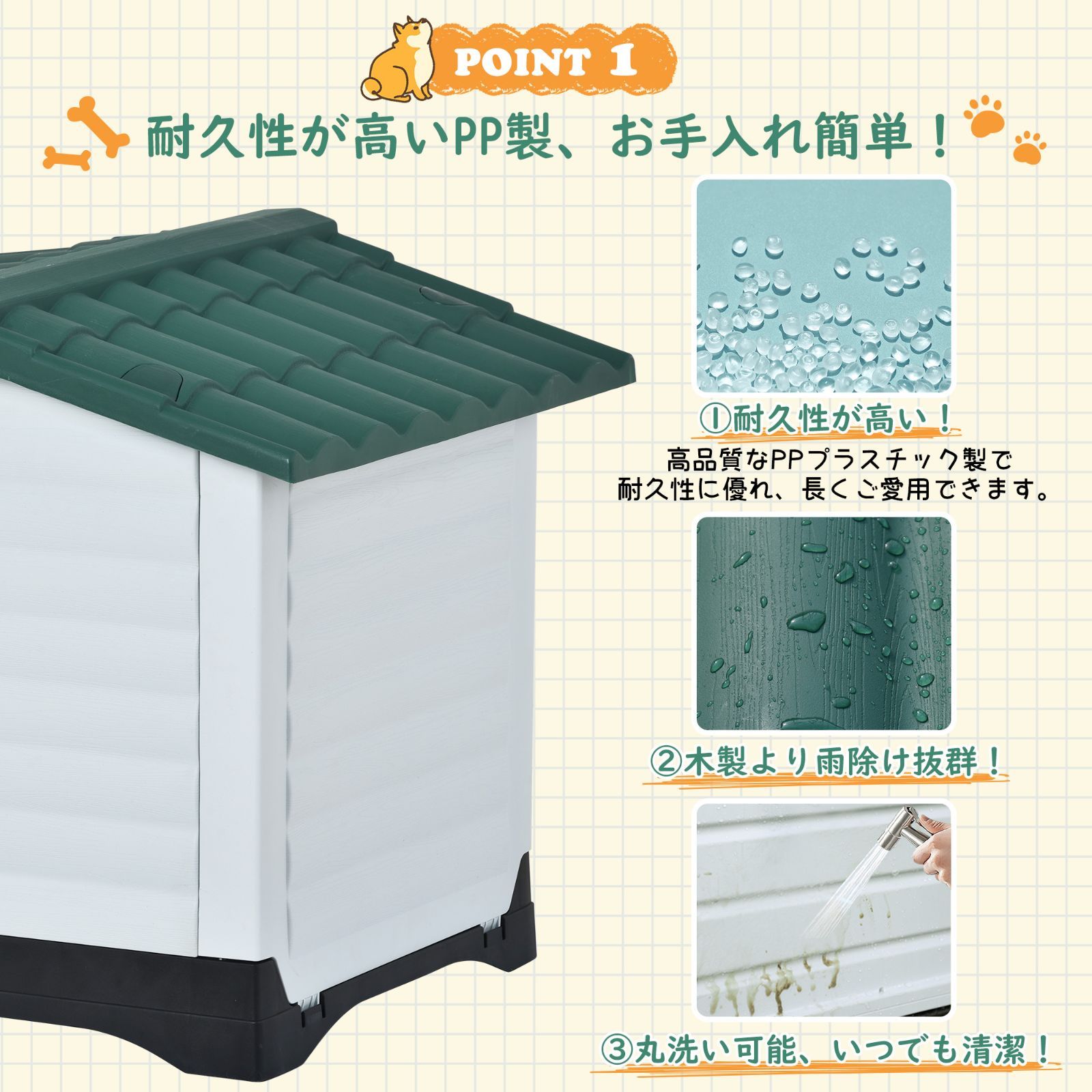•【高品質な素材&耐久性】高品質なPPプラスチック製で耐久性に優れ、長期間ご使用いただけます。材質が丈夫で長持ちし、犬小屋が犬に壊されにくいです。普通の木製ドッグハウスと比べ腐食や雑菌の繁殖を防ぐ能力が強いです。室内、テラス、中庭、裏庭などの場合に設置、愛犬に快適で安全な居場所をを提供します。
