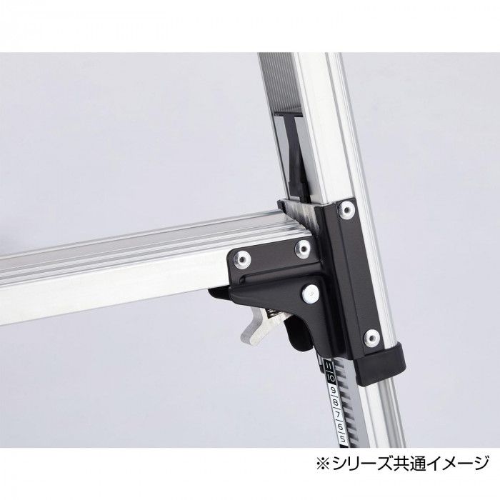 丈夫さはそのままに軽量化を実現。肩当たりも改善し、負担も軽くなりました。開き止めが進化!新開発「ワンタッチバー」で作業効率が向上。天板がフラットになり、袖や腰袋の引っかかりを防ぐ。移動の際は、バーを掴んだらそのまま開き止めを解除しながら持ち上げられる。踏ざん裏に張りを持たせ、肩当たりをやわらかく。下部操作レバー。アジャスターには目盛りが付いているので段差の違う現場でも調節が簡単。