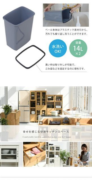 木目調とガラスのカントリーテイストが可愛いリュッカランドのキッチンシリーズ。斜め開閉の下部には付属のペールが2つ収まる収納部を完備!ゴミの分別もばっちり。