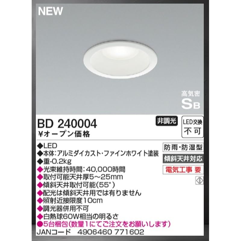 商品名:コイズミ LED ダウンライト 防雨・防湿型 埋込穴φ100 昼白色 白熱球60W相当 5台梱包 ファインホワイト BD240004