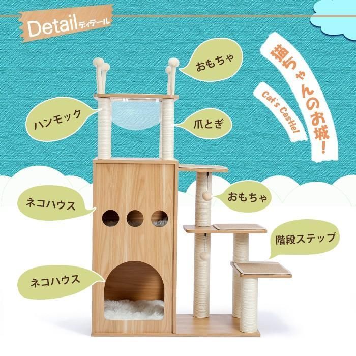 【独特な自社デザイン、お城みたいに】本製品はお城をベースにしてデザインされた木目調キャットタワーです。広くてクッション付きの猫ハウス二つ、透明なハンモック、マット付きのステップ、お城の形、全体的におしゃれなキャットタワーです!伝統的な布製キャットタワーに比べ、もっと頑丈で、耐久性が優れています。もし汚れたとしても、簡単に手入れできます。