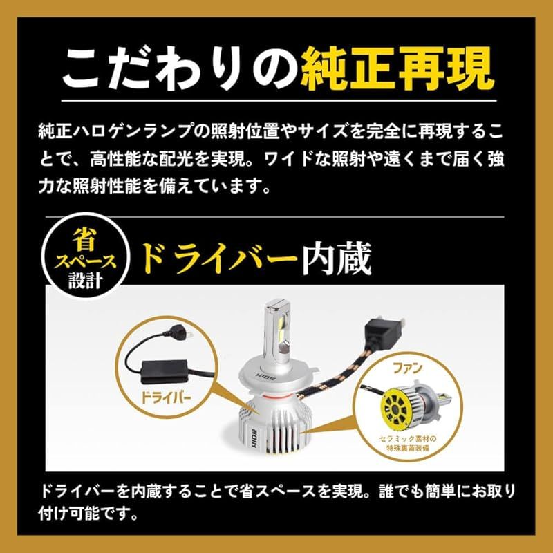 【ドライバー内蔵で簡単取り付け】 ドライバーを内蔵した省スペース設計により、複雑な配線を必要とせず簡単に取り付け可能。多くの車種で手軽に交換できるため、初めての方にも安心です。さらに特注モーターを用いた冷却ファンは静音性に優れ、装着後すぐに快適で明るい走行環境を体感できます。