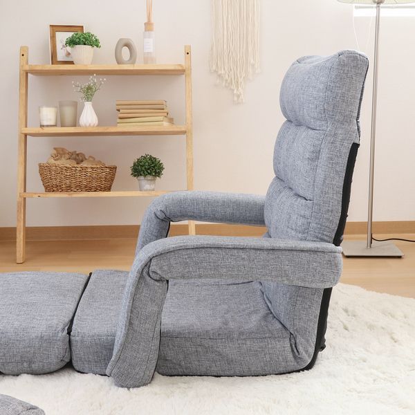 高い強度、耐久性を誇るKOYO製のギアを使用。背もたれをお好みの角度に調整できます。ボリューム感のある肉厚クッションで立ち座りもしやすい!クッション付きで腰当てや枕としてお使いいただけます。座面を広げればゆったり足を伸ばしてリラックスできます。座面は本体から取り外しできるので、分離して座布団のように使うことができます。ひじ掛けは背もたれに連動するのでフラット状態にでき、お昼寝にも最適です。来客時などで邪魔になったときは、折りたたんで隙間に収納!